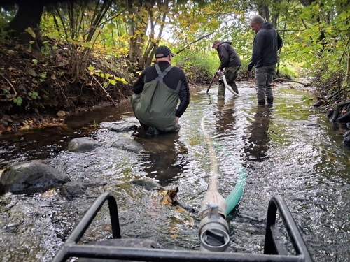 Lørdag brugte vi tid på Møllebæk ved Hornborg, hvor vi for over 15 år siden lagde 5 gydebanker ud. Disse blev også spulet sidste år, og igen i år måtte spuleapparatet frem for at få løsnet sandet mellem gydegruset. Der er en del sandvandring i dette vandløb, så her vil vi gerne lufte gydebankerne ofte – og vi har et rigtigt godt forhold til den lokale lodsejer på savværket.